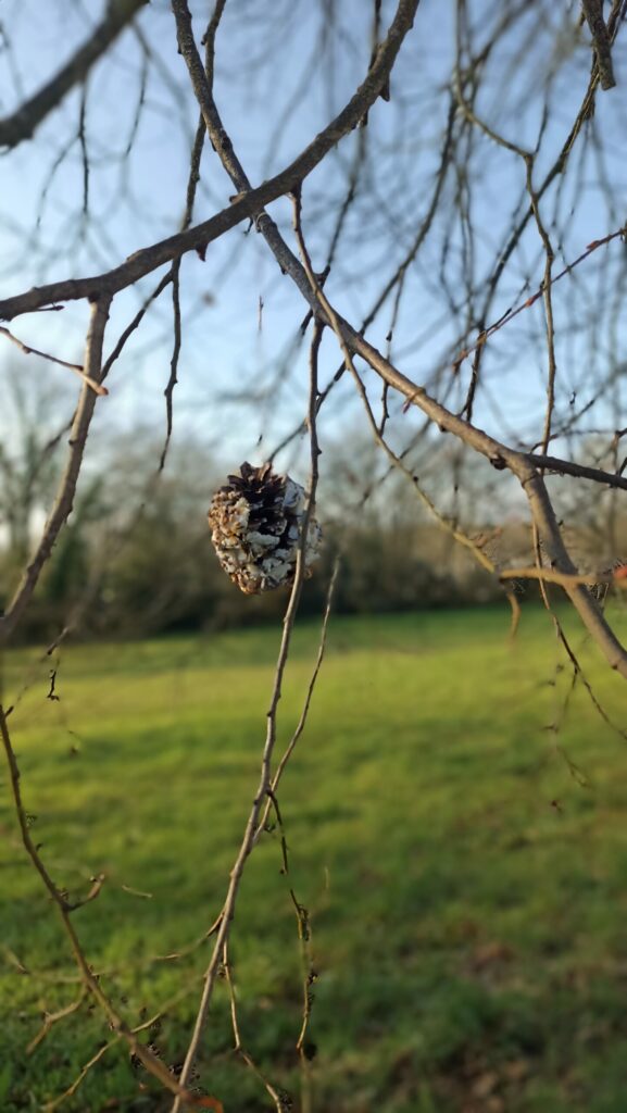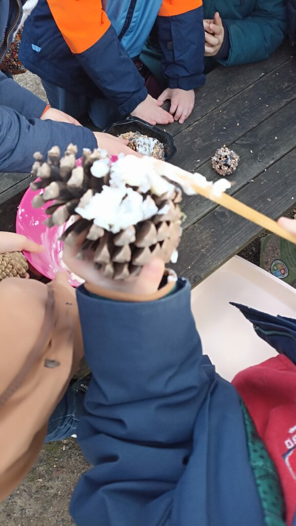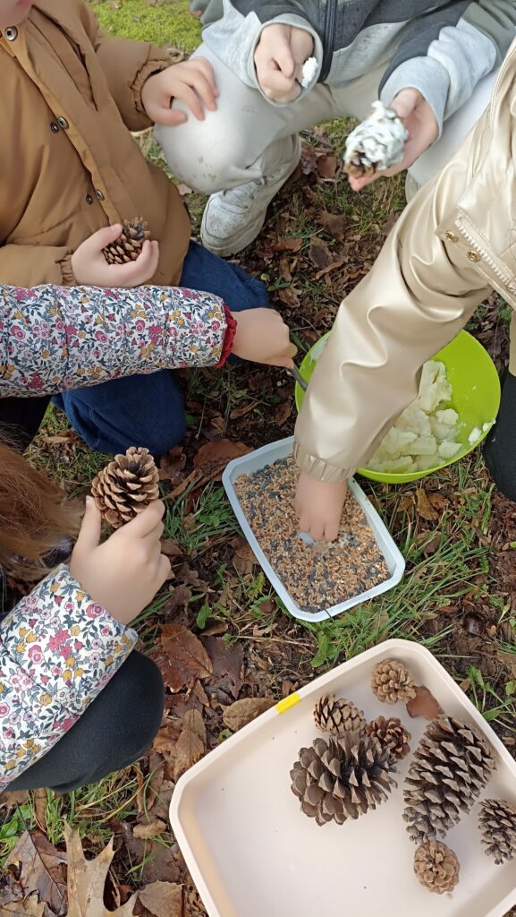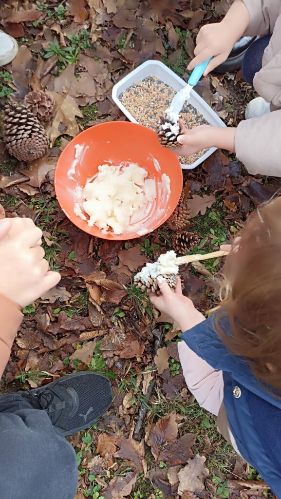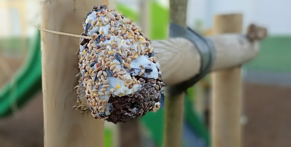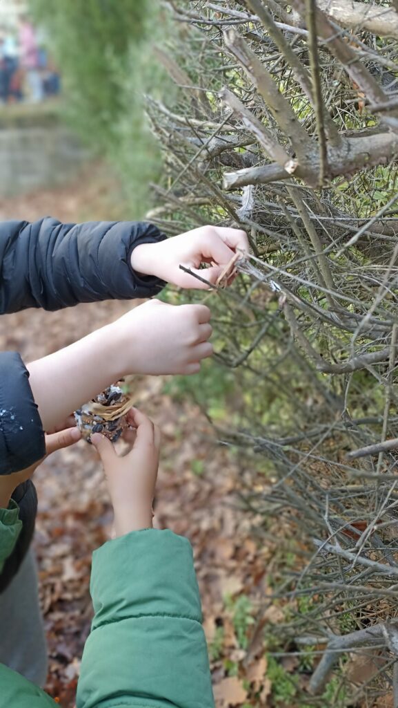 Ils ont préparé ensemble des boules de nourriture pour les oiseaux : graisse végétale, pommes de pin et graines. Les enfants ont ensuite accroché ces boules sur le grillage du jardin, dans les buissons près de l’école et dans les arbres des cours de récréation.